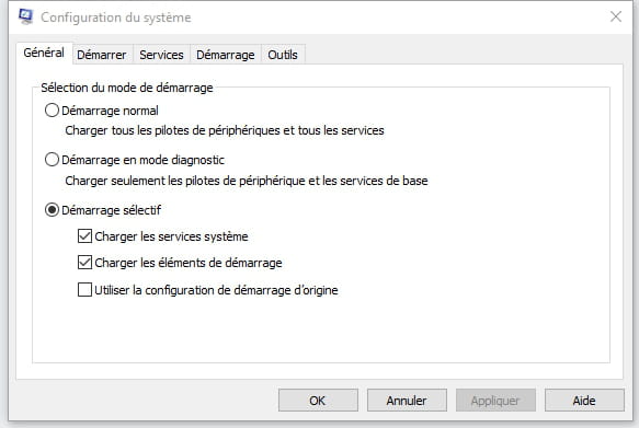 - Onglet "Général" permettant de sélectionner un mode de démarrage.